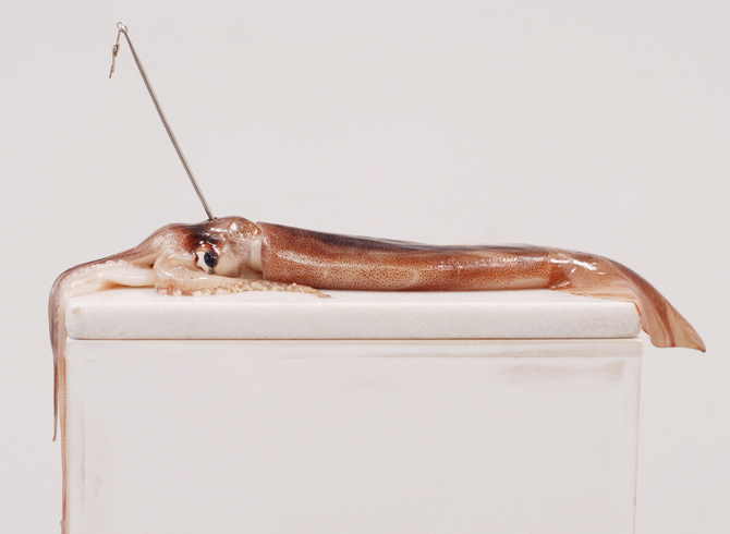 Terror, muerte y amor es la obra de Carlos Herrera, ganador del premio Petrobras 2011 ArteBa-Buenos Aires-Argentina. En esta pieza, el artista continúa con una serie de reflexiones recientes sobre la muerte, la desaparición y la descomposición de la carne. Todos los días, un calamar vivo será sacrificado en la sala de exposición por las manos de un verdugo que lo atraviesa con una lanza. El animal muere lentamente. La investigación de Herrera ha revelado que el calamar es el único ser cuyo cadaver huele exactamente igual al cadaver humano.