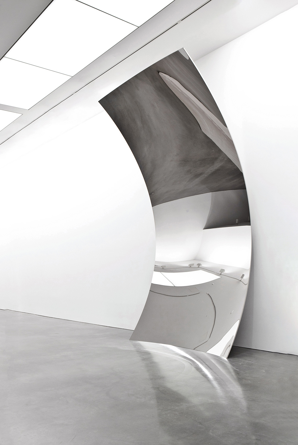 One of the earliest pieces in the exhibition, Non Object (Plane) (2010), captures this quality with surprising simplicity. A folded sheet of polished steel rests against the wall, its reflective surface subtly bending the surrounding space. Its reflective surface continuously reshapes the surrounding gallery, producing an image that seems to extend beyond the sculpture’s physical limits. What first appears as a minimal gesture slowly becomes more disorienting: a surface that quietly unsettles one’s sense of orientation.