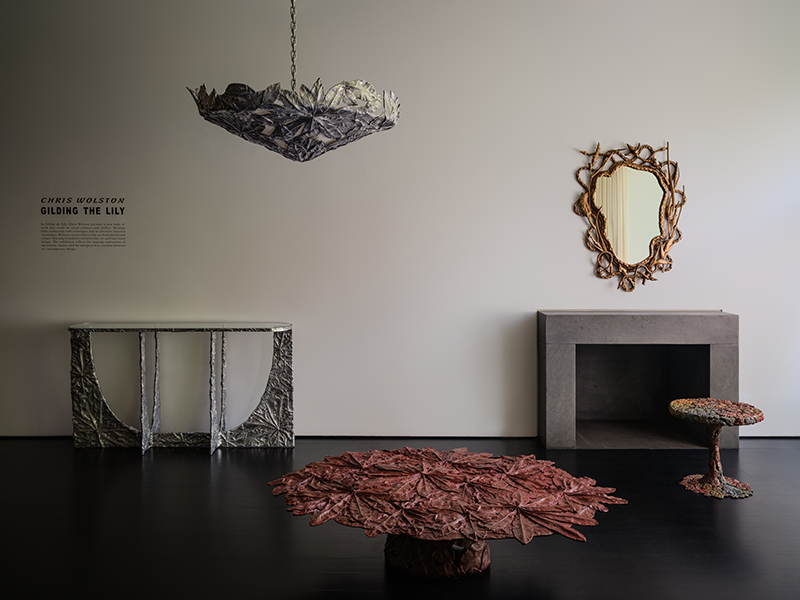 Art Nouveau emerged in the late 19th century as a movement that sought to break free from traditional artistic conventions and create a new, modern visual language. Deeply inspired by nature, it celebrated the unity of art and life through organic lines that intertwined beauty, craftsmanship, and functionality. This sensibility serves as the main inspiration for artist and designer Chris Wolston in his latest solo exhibition, Gilding the Lily, presented at The Future Perfect in New York. Returning to an unusual place — where rigid materials meet fluid form — Wolston challenges the boundaries between the static and the alive. His work evokes movement within stillness, exploring how seemingly inflexible materials can express softness and vitality.