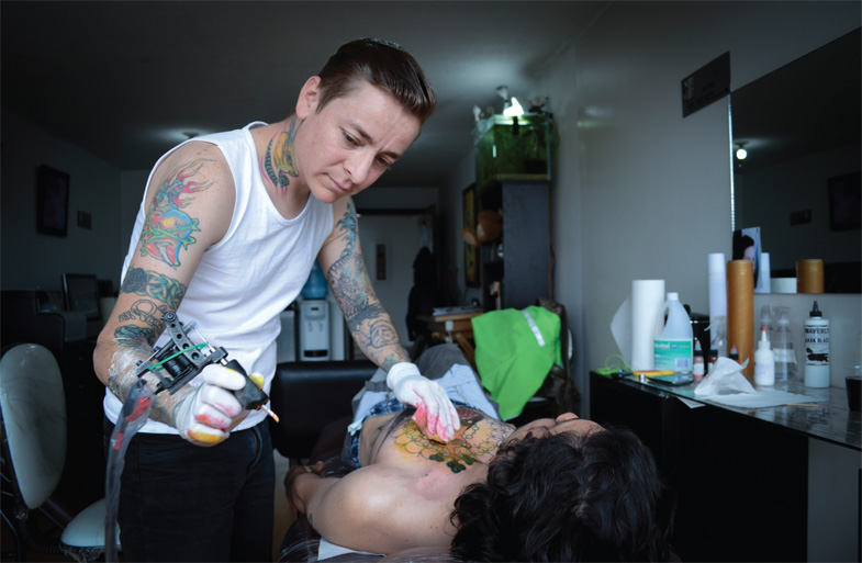 Incomunicados de los avances del mundo civilizado, absorbieron de revistas y noticias de viajeros las tendencias de un estilo que avanzaba vertiginosamente y se quedaron con algunas nociones tergiversadas de ese flow artístico. Entre Cali y Bogotá se creó la primera red social en torno al arte de la piel construida sobre el respeto de una jerarquía forjada en nombre del talento. En ese entonces, corría la década del noventa y los clientes pedían símbolos marineros o dibujos sencillos que no exigían al dibujante. Así, los más osados pasaban sus días cumpliendo los deseos de otros mientras buscaban expresar su talento.