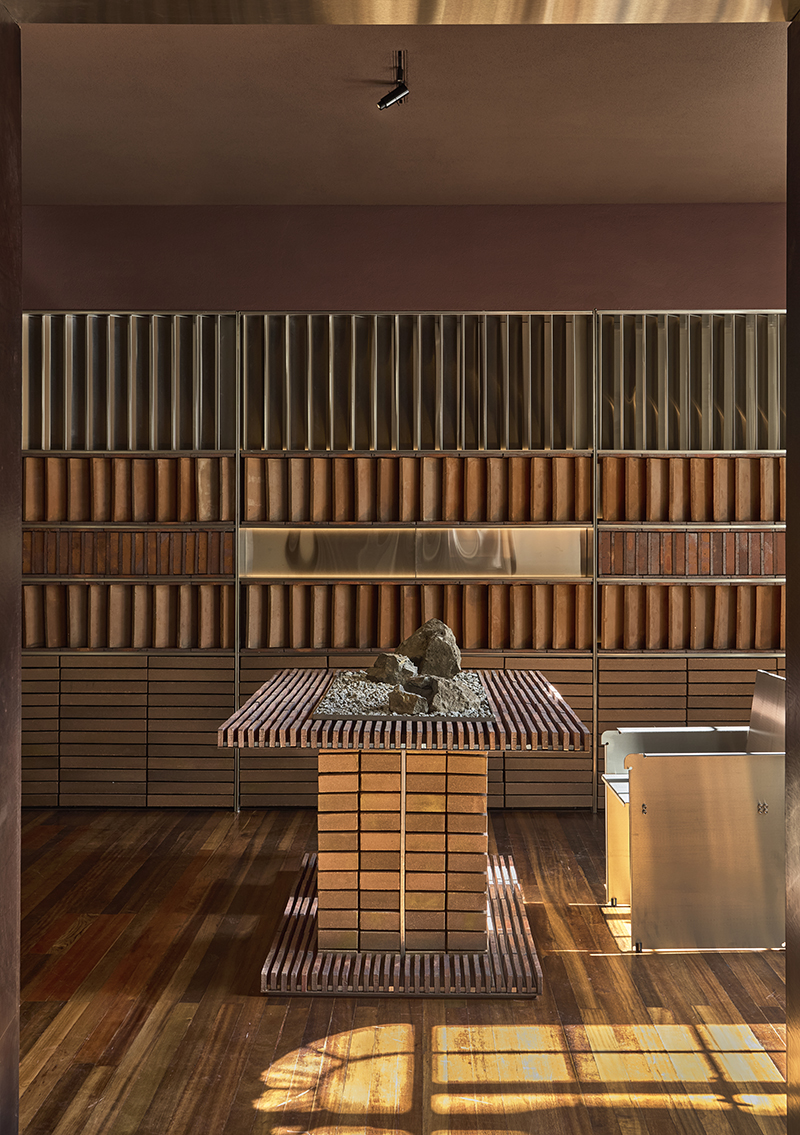 En este espacio, ar_ea trabaja con la arcilla como material principal, explorando su potencial para construir un ambiente fresco y contemporáneo. Extraída de Amagá, Antioquia, la arcilla se transforma en una serie de ladrillos utilizados tanto en un muro celosía como en un escritorio sostenido por columnas de ladrillo prensado. El estudio juega con la ancestralidad y la tradición para proponer un espacio moderno, donde la materia conserva su memoria.