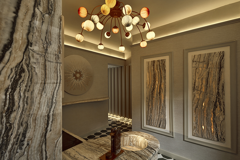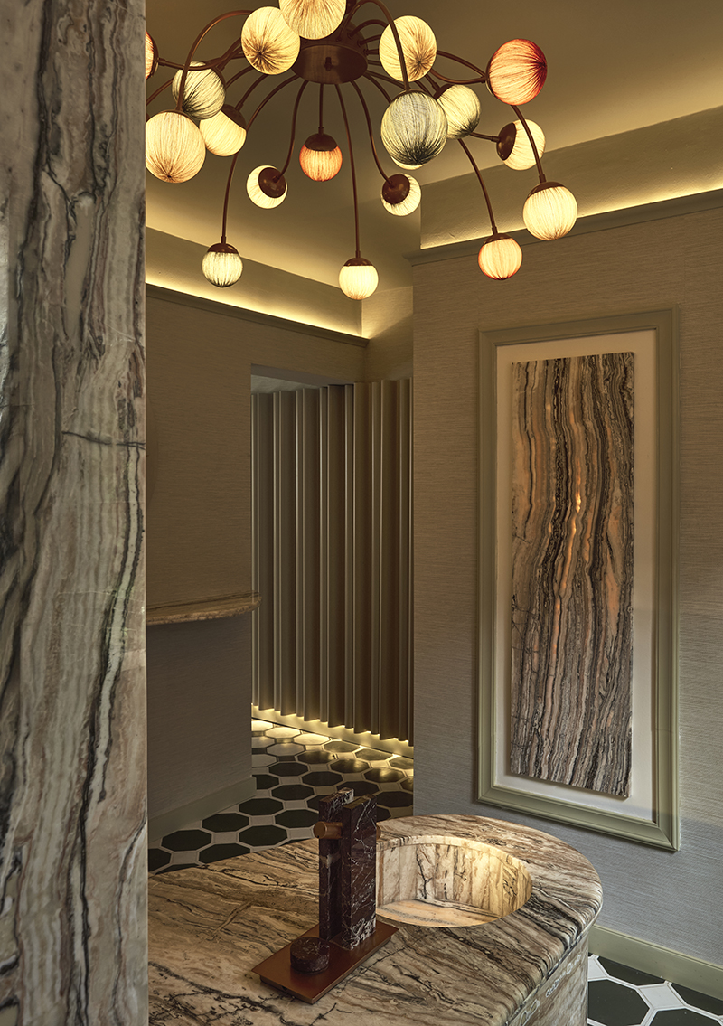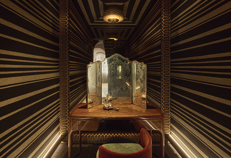 This space was conceived to transform the everyday into ritual. Inspired by the ancient dressing table—understood as an intimate place full of wisdom, power, and pause—the bathroom proposes a return to that moment of personal contemplation. Clad in a striped textile designed by Ele.Ve, the space creates a hypnotic and reflective atmosphere, where design invites one to slow down and inhabit time differently.
