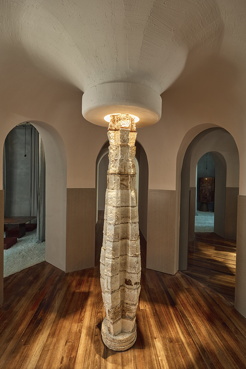 Estudio LAP (Left Angle Partnership) occupies the first space of the apartment—the vestibule that gives access to the other rooms. Upon entering, we encounter a piece built from mycelium and concrete, where a dialogue unfolds between the organic and the fluid, the rigid and the constructed. Two materials with distinct processes meet to give life to a structural yet dynamic piece, in which form emerges from the exchange between nature and technique.