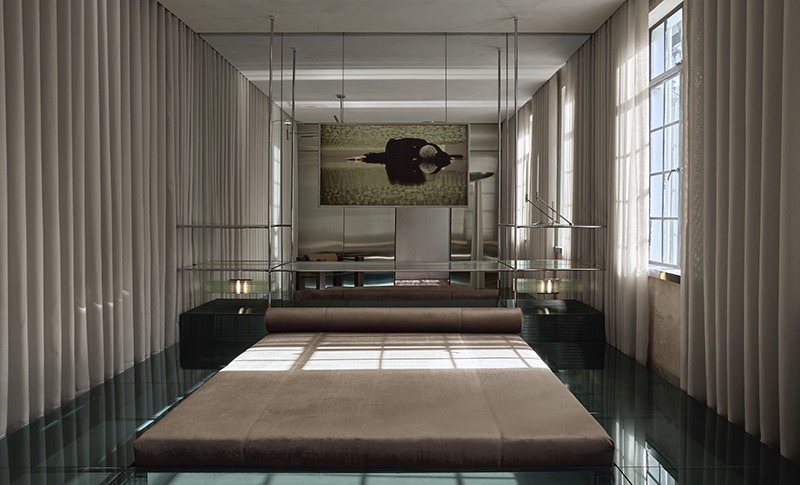 Studio Peraza intervenes in the main bedroom, using glass as the main material. The space plays with visibility and invisibility, generating an atmosphere of profound lightness. A metallic structure with glass surrounds the bed, creating a sensory experience that recalls the 1970s and 1980s, where the visitor perceives the passage of time.