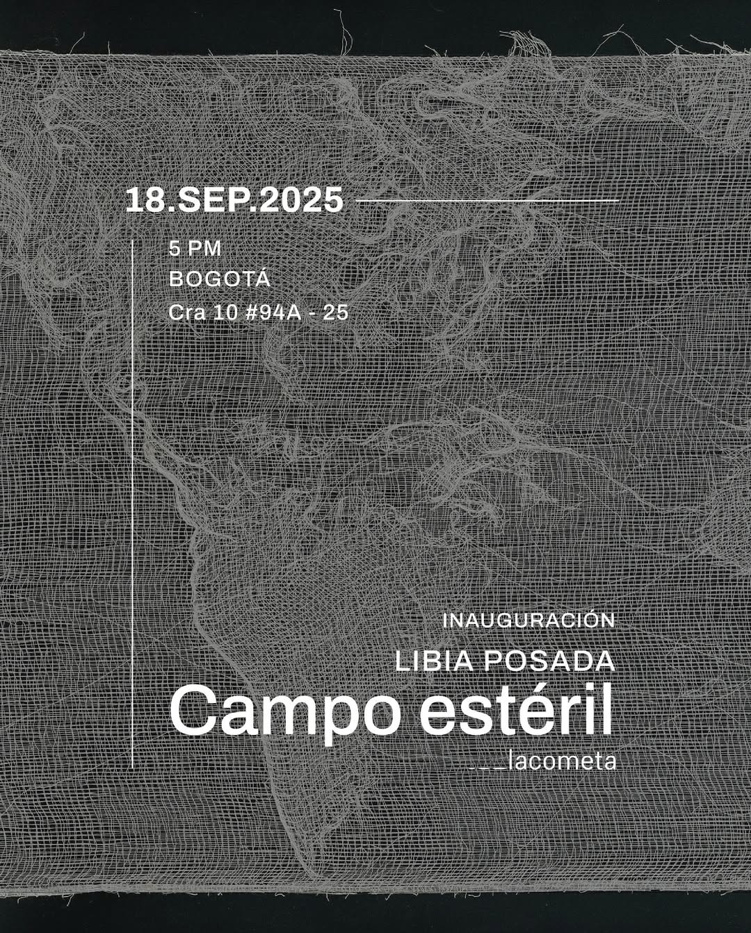La Cometa also presents “Campo Estéril” in the second-floor gallery, the solo exhibition of artist Libia Posada.Libia Posada, a trained surgeon from the University of Antioquia and a multidisciplinary artist, develops her work at the intersection of art, medicine, politics, and society. While her practice is informed by her medical background, it goes beyond a fascination with the organic and biological, exploring representations that question and reflect on our collective experience.