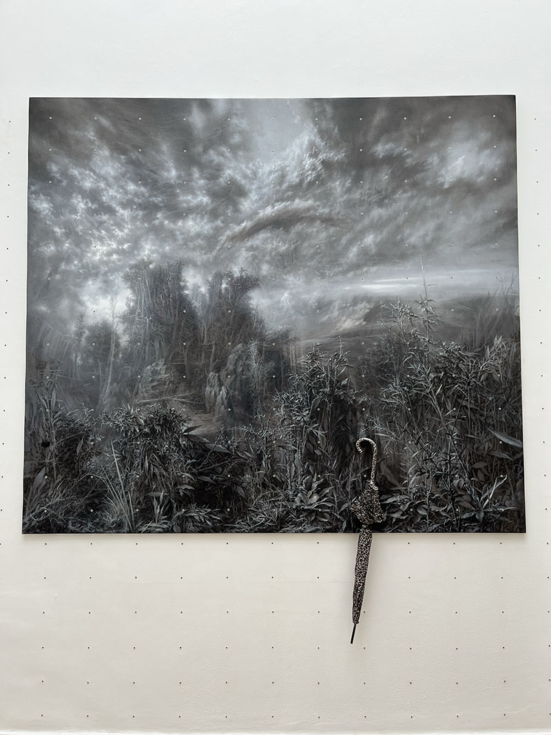 In Normas para no estar, Pipo Hernández Rivero invites visitors to hang and unhang their personal belongings on coat racks placed next to his landscapes. This seemingly trivial act becomes a small ritual of passage, turning the everyday into a symbolic experience about presence and time.