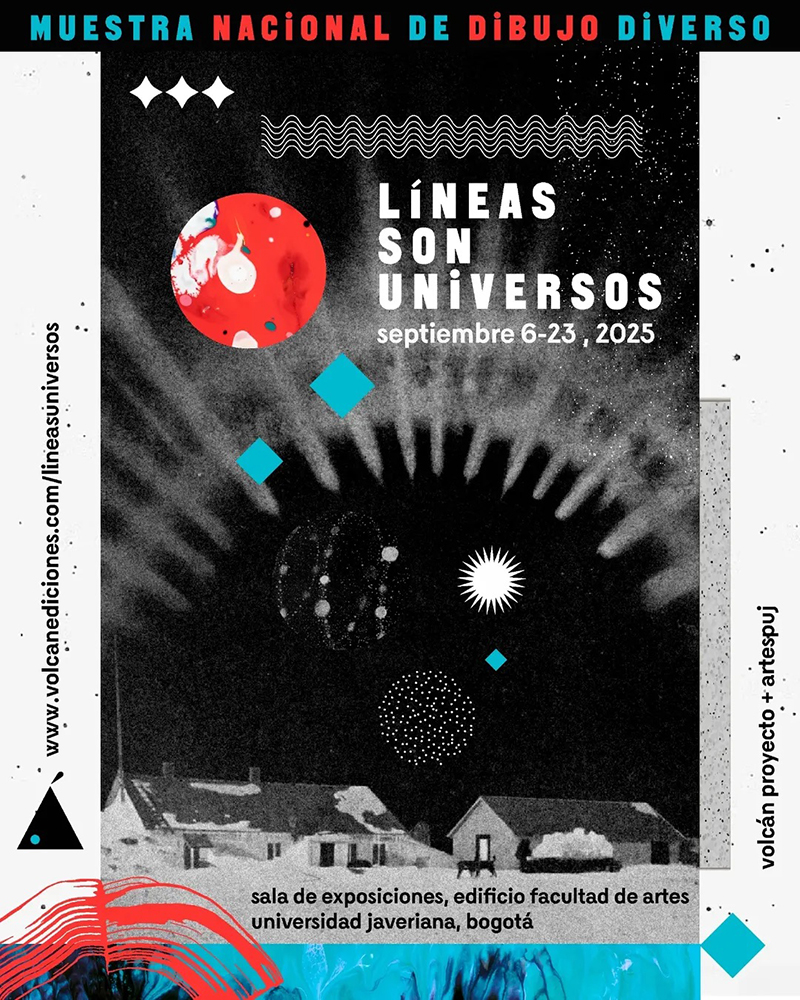 A national exhibition of diverse drawing organized by Volcán Ediciones. More than 600 works by artists of all ages and from different regions of Colombia come together in a space that celebrates imagination and the multiplicity of perspectives. The exhibition will be open from September 6 to 23, 2025, at the exhibition hall of the Faculty of Arts at Pontificia Universidad Javeriana in Bogotá.