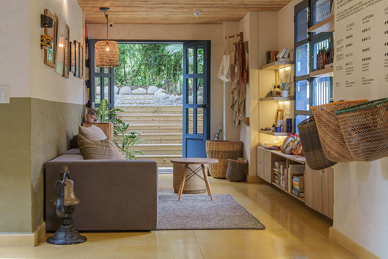 La coherencia entre discurso y acción se percibe en cada detalle. Las paredes de bahareque fueron levantadas con materiales locales, incluida la tierra extraída durante la misma obra. La madera, proveniente de fuentes responsables, fue aprovechada en su totalidad, celebrando el valor de los recursos naturales. Este respeto por los materiales se extiende a todo el espacio: paredes bioclimáticas que regulan la temperatura, tanques de recolección de agua lluvia, toallas de algodón natural, gestión responsable de residuos y un menú 100% vegetal, preparado con ingredientes orgánicos y de producción local. A esto se suma la formación continua de su equipo, entendiendo que la sostenibilidad también se aprende, se comparte y se vive colectivamente.