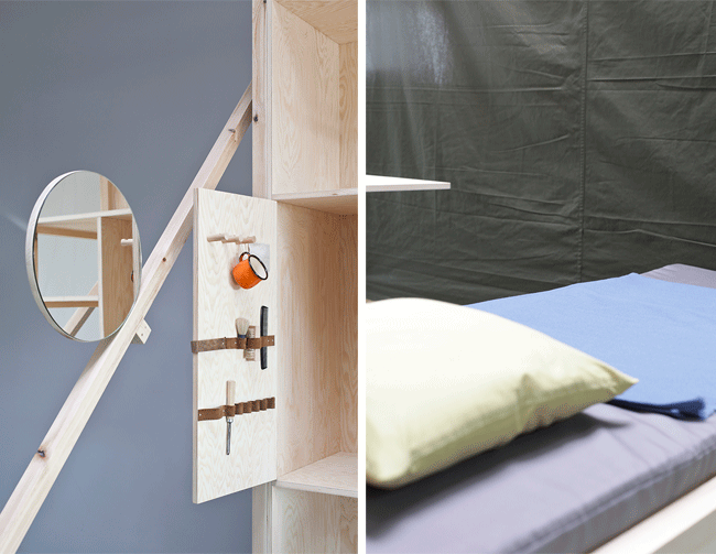 El cubo multifuncional cuenta con un escritorio que puede cambiar a cocina, un armario con ruedas que si se despliega es un comedor para dos personas, un cama, un closet, un espejo y un cajón. Todo el cubo puede cerrarse con tela para proteger los espacios íntimos y puede ser instalado en aproximadamente una hora.