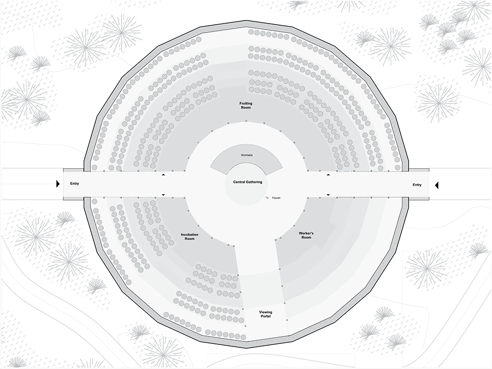 Here, the brief begins with a specific function: mushroom cultivation. However, the project extends this purpose by embedding it within a broader network of local exchange. The pavilion not only produces, it also operates as a space to share the process with nearby communities and connects to the foundation’s kitchen and other spaces in the area. The form follows that logic directly. It is an oval, self-supporting volume, defined by the interior organization required for mushroom growth. Rather than an autonomous formal gesture, the geometry works as an optimized container: a contained space with just enough environmental control for the process to take place.