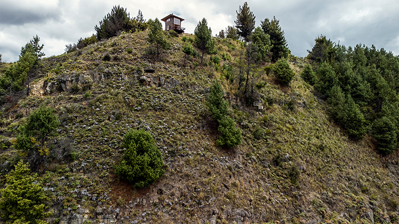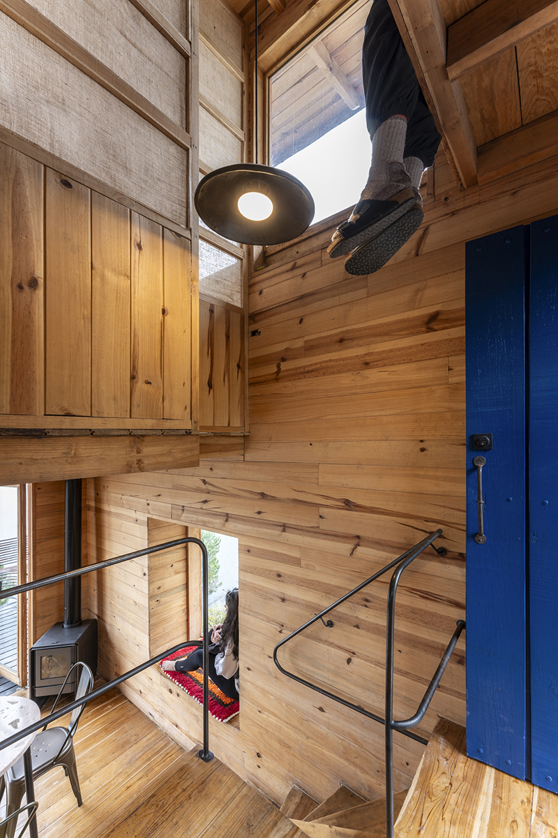 The material of this shelter resonates with primitive life and the surrounding nature. A roof with wide eaves holds dark clay tiles that shimmer like wounds of light. The exterior is clad in yellow pine wood, its amber tone revealed as the alchemy and chance of time; inside, it is shown in its natural state, in dialogue with pipes, mechanisms, woven rugs, and clay lamps from La Chamba, crafted by the brand EnTierra.