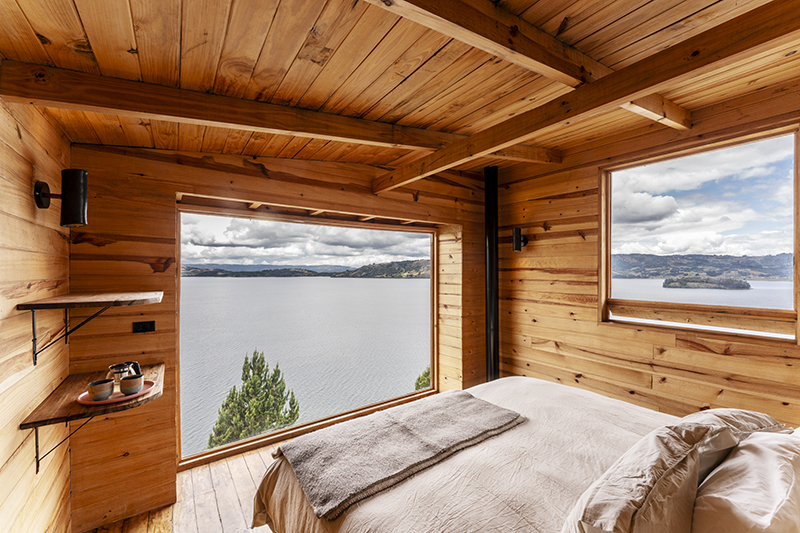 La materia de la que está hecho este refugio resuena con la vida primitiva y la naturaleza circundante. Una cubierta de grandes aleros sostiene tejas de arcilla oscura que refleja visos como si fueran heridas de luz. El exterior está revestido con madera de pino amarillo, con un tono ámbar que reconocemos como fruto de la alquimia y el azar del tiempo; en el interior, se exhibe natural en diálogo con tuberías, mecanismos, tapetes tejidos y lámparas de barro de La Chamba, fabricadas por la marca EnTierra.