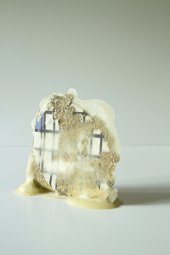 La fotografía acá, por otro lado, sí registra la obra terminada, y por lo tanto entra a atestiguar el resultado de la unión de cosas que a su vez atestiguan eventos diversos: un viaje en avión, una barra de chocolate en un momento de hambre, la oportunidad de agrandar su combo de McDonald’s… El artista lavó sus dientes, tomó cervezas, compró goma de mascar, fue a una fiesta, encontró una vieja fotografía… y esto lo llevó a pensar en la importancia que se le da en el mundo de ahora a los objetos desechados. El intenta rescatarlos, y por eso escoge una bolsa zip para contenerlos, pues, contrario al desecho, esta bolsa pretende preservar, intacto y por mucho tiempo, lo que guarda.