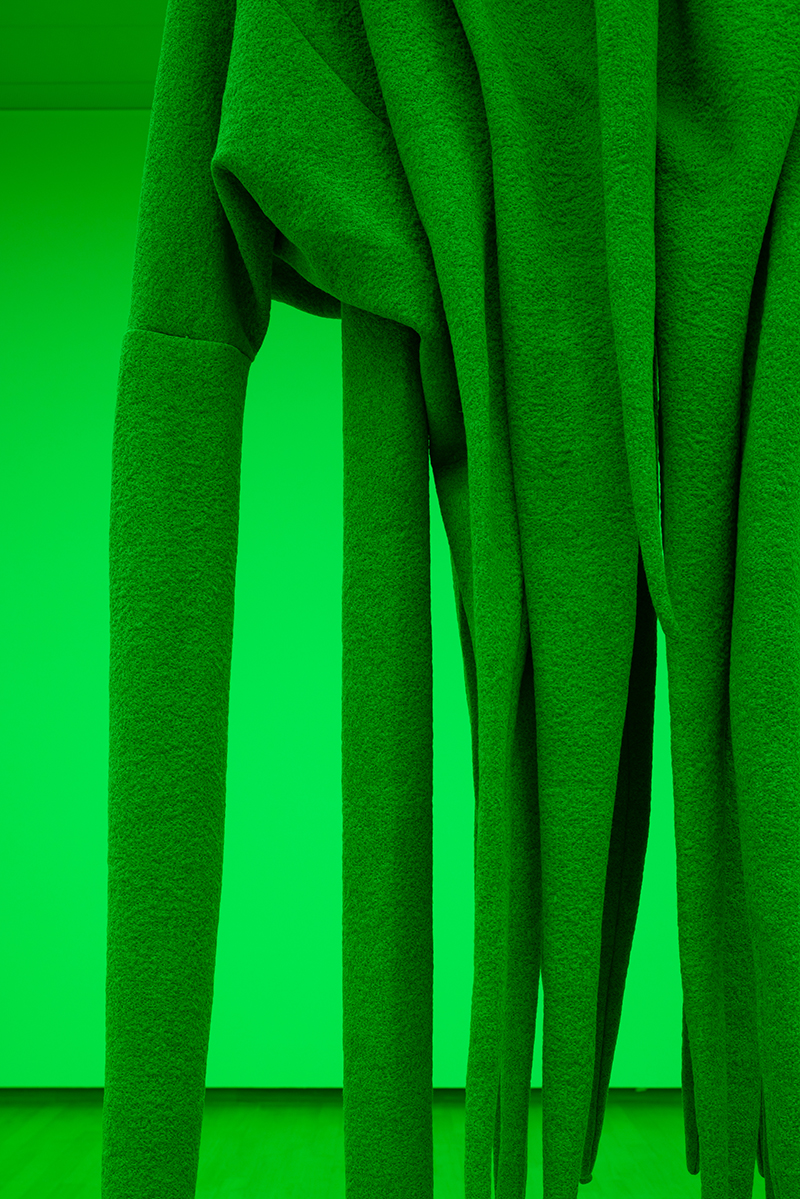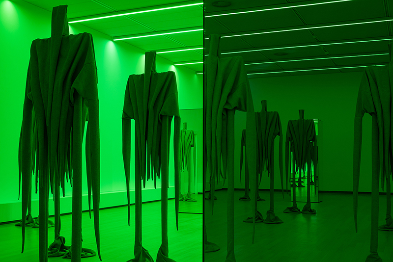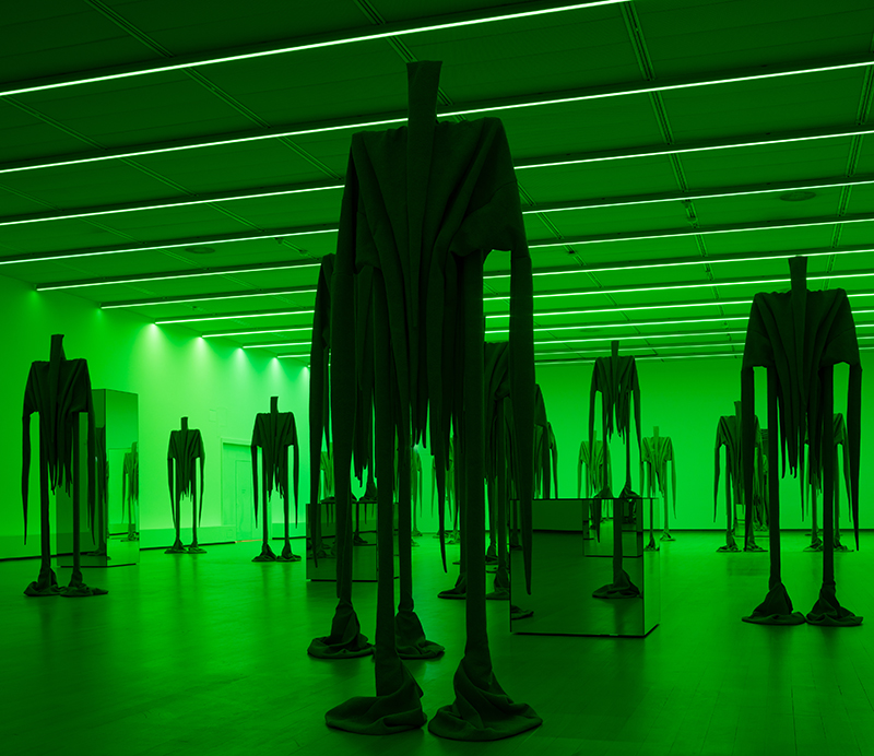 En Skin to Skin —abierta hasta el 11 de enero de 2026—, presenta su instalación más ambiciosa hasta la fecha: 55 esculturas idénticas en un paisaje verde y eléctrico. Este resplandor transforma la percepción del espacio y de los cuerpos, jugando con la repetición y la luz.