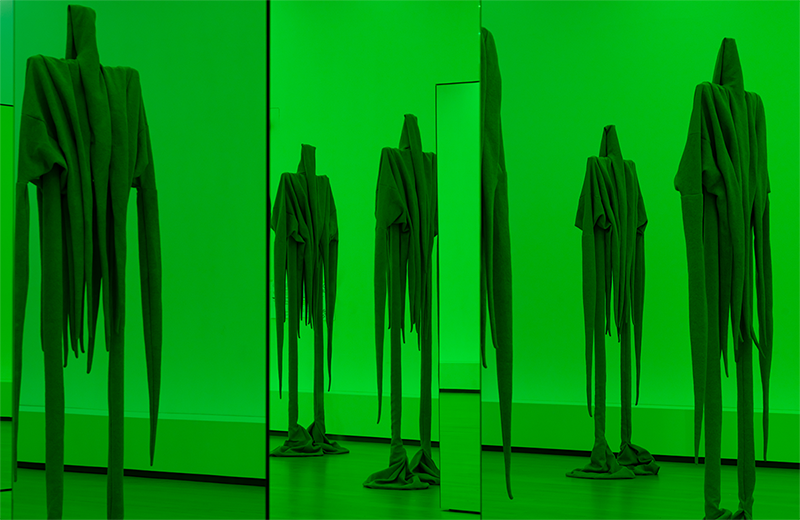 In Skin to Skin —on view until January 11, 2026— she presents her most ambitious installation to date: 55 identical sculptures inhabiting a green, electric landscape. This glow alters the perception of space and bodies, playing with repetition and light.