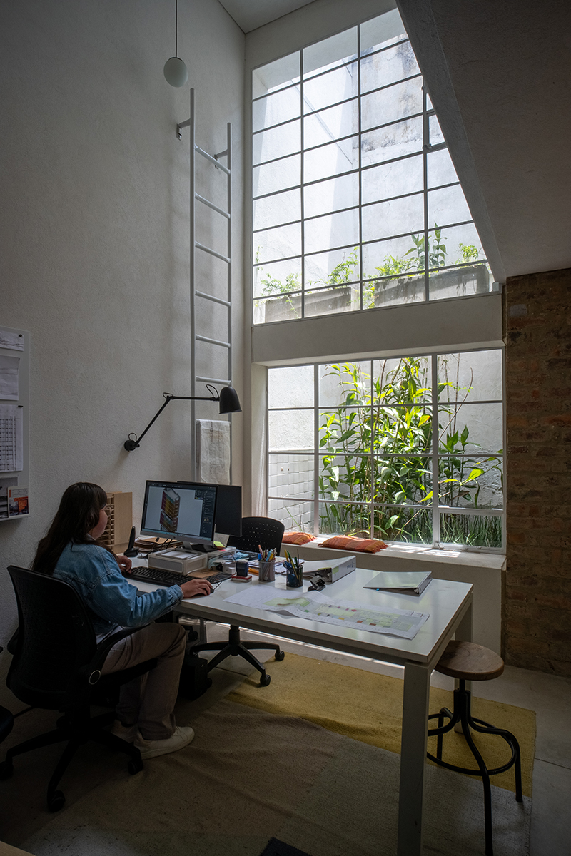 Materiality becomes essential in this exploration. Stone pigments, marble dust, and the reddish tones of brick enhance the sense of warmth while maintaining the neighborhood’s aesthetic identity. The house is organized into three areas—living space, workshop, and a flexible rental unit—allowing different ways of living and producing to coexist.