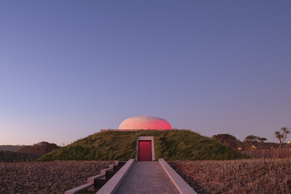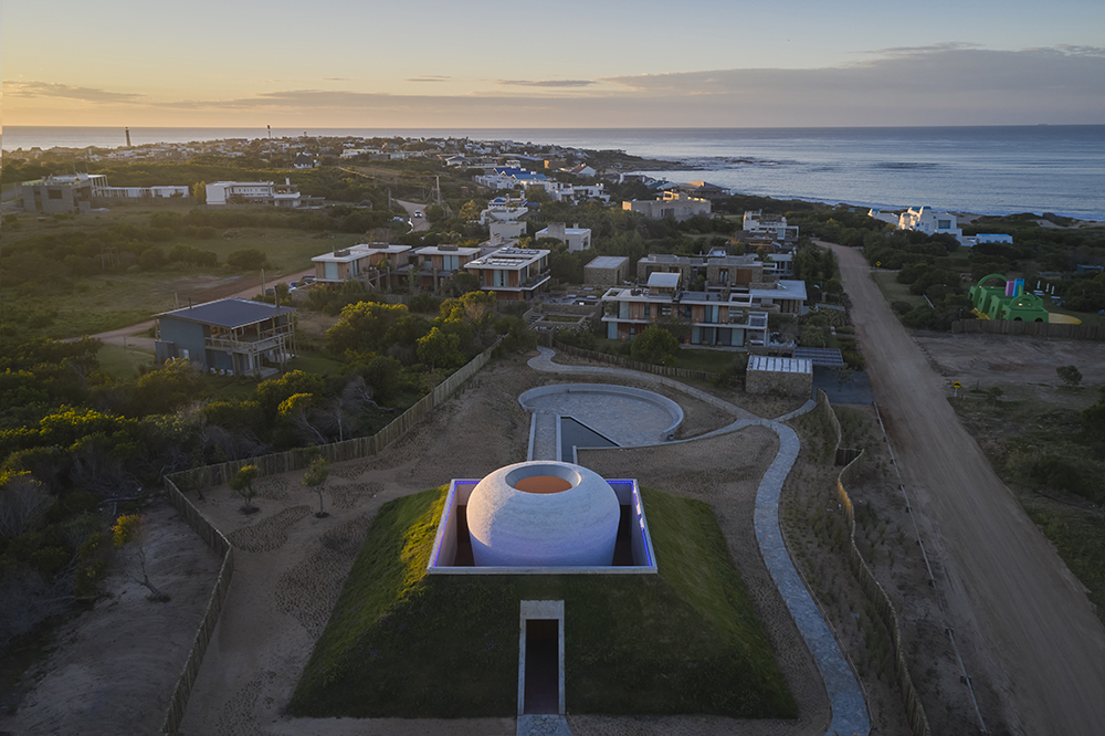 Ta Khut was inaugurated on November 20, 2021, in the coastal region of José Ignacio, Uruguay. It is the first freestanding Skyspace in South America and, to date, the only permanent work by James Turrell in the region. The piece is part of the park at Posada Ayana, a 21-room hotel whose aesthetic draws inspiration from the Côte d’Azur of the 1950s and 1960s. The project was driven by its owners and creative directors, Robert Kofler and Edda Kofler, who worked for more than two years with Turrell and his team to develop and integrate the work. The structure — 9.44 meters in diameter and 7.62 meters high — is built from white Laas marble and rises on a rectangular base covered with soil and grass.