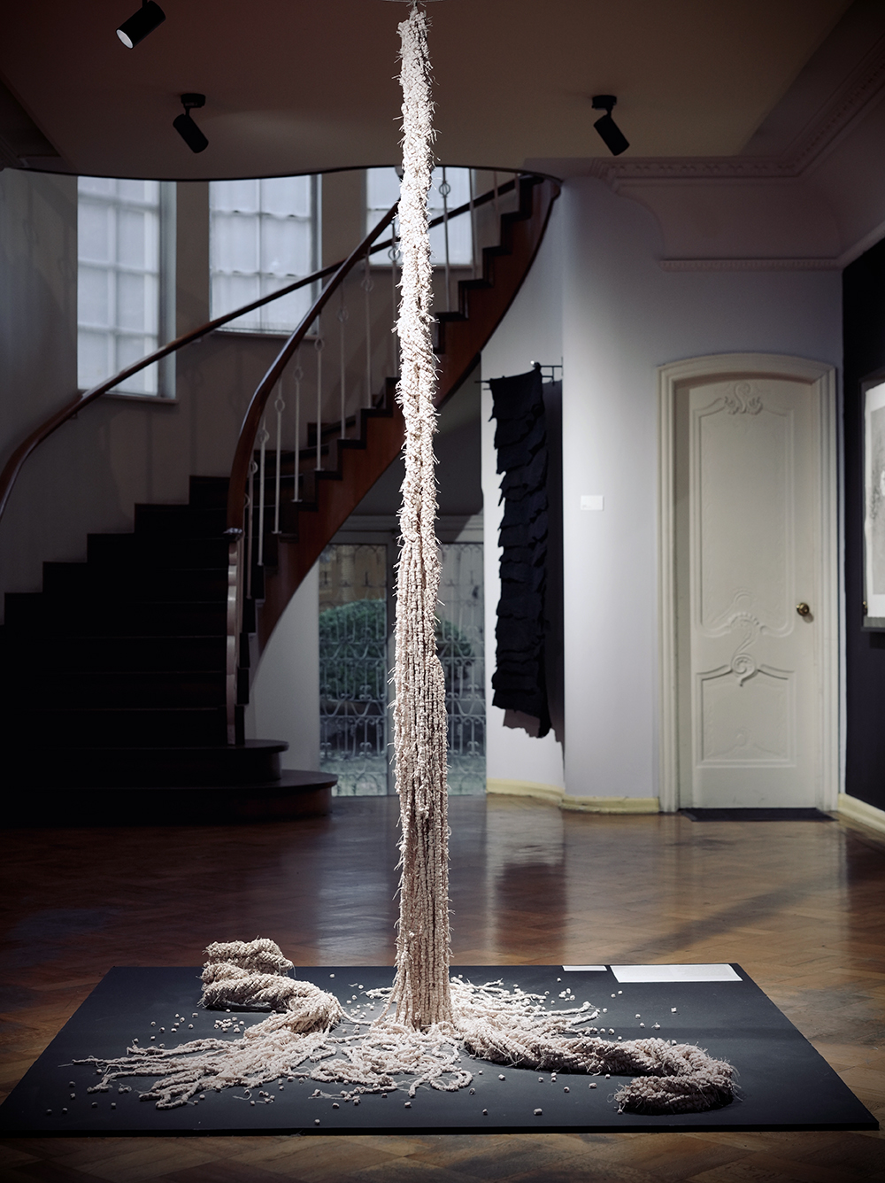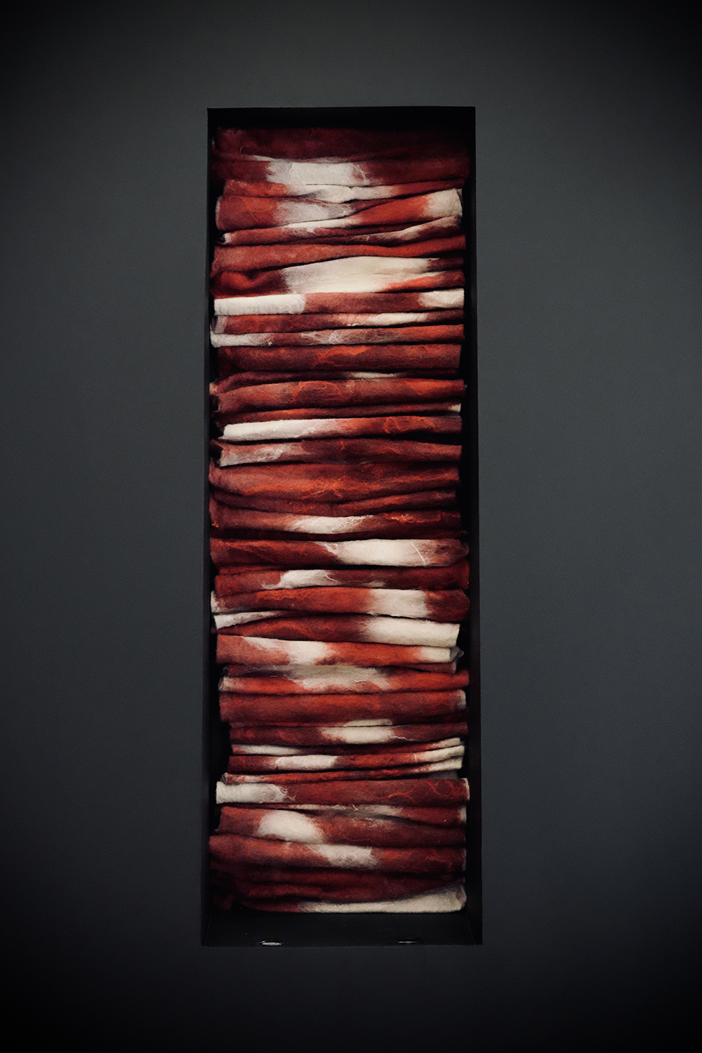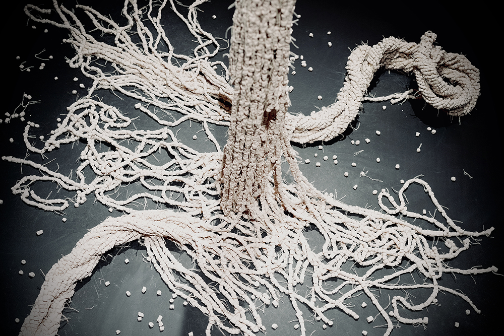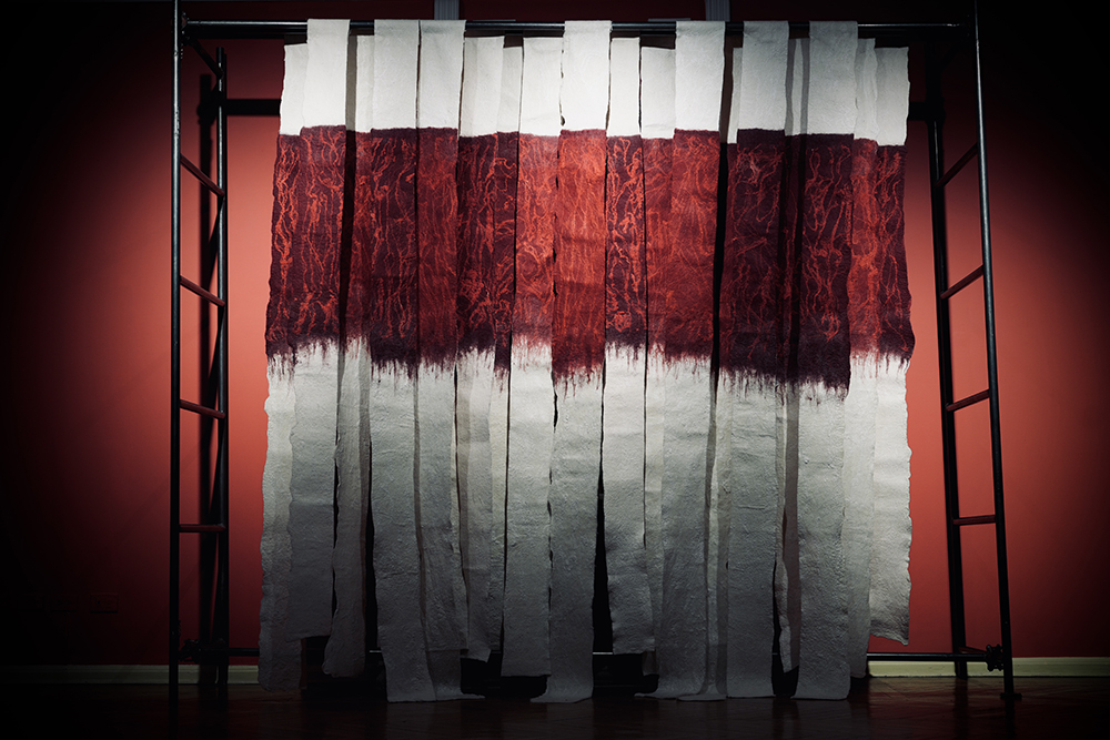 The exhibition brings together eleven works that explore diverse media and processes: ceramics, thread, red and white felt membranes, weaving, and knotting. As curator Érika Martínez Cuervo explains: “To exhibit what is inside, to let ourselves be seen, without fear.”