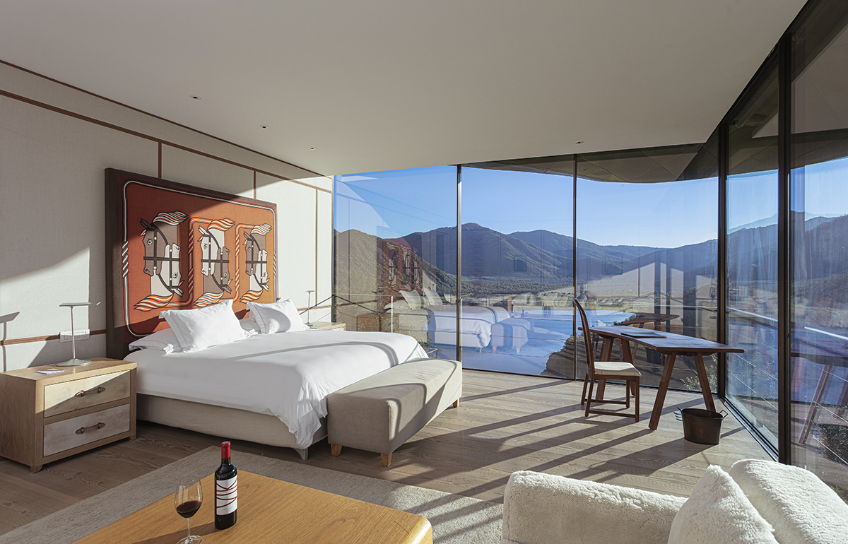 In Millahue, VIK operates as a unified concept where the winery and hotel share the same vision: the landscape is the core, and the architecture adapts to it. Conceived as an integrated project combining wine, art, and design, its approach to luxury is rooted in sensory experience, a deep connection to the territory, and attention to detail. Architecture is one of the hotel’s most striking features. Designed by Uruguayan architect Marcelo Daglio, the building is defined by its golden titanium roof and a structure inspired by the mountains and the movement of the valley’s winds.